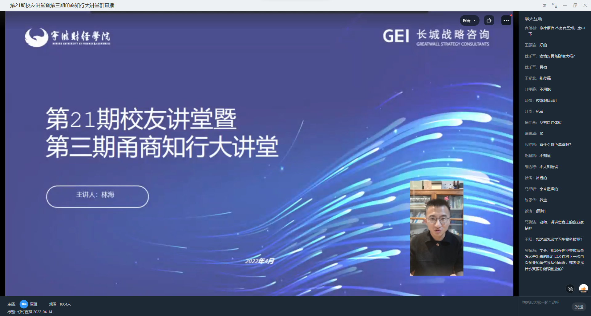 传递优秀经验,共享成长智慧——第二十一期校友讲堂暨第三期甬商知行大讲堂4月14日下午,“走进校友讲堂,共享成长智慧”第二十一期校友讲堂暨第三期甬商知行大讲堂通过钉钉线上直播的方式顺利举行。本次活动由宁波财经学院校友工作办公室及工商管理学院联合长城战略咨询共同举办,由商业模式实验室、长城商学院承办,很荣幸邀请到学校2010届营销专业校友、丽水市电商促进会副会长、宁波财经学院丽水校友会副会长、懒猪窝民时间:2022-04-15 -