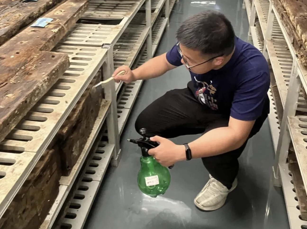 更换浸泡液、监测数据、清理锈结物……30天到40天一个周期,每次换液前,都要用凿子一点点清理钉孔位置顽固的锈结物,再配合化学试剂浸泡。每天的工作变成了重复的循环。
